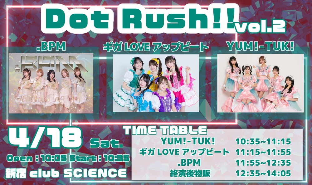Dot Rush!! vol.2 SCHEDULE 2026/04/18(土) 10:35 - 14:05 新宿club SCIENCE 開場10:05 開演10:35 出演時間 10:35~11:15 特典会 12:35~14:05 会場 新宿club SCIENCE チケット ¥3,000+1D 指名入場特典 特典券1枚 チケットはこちらから URLをコピーする 報告する