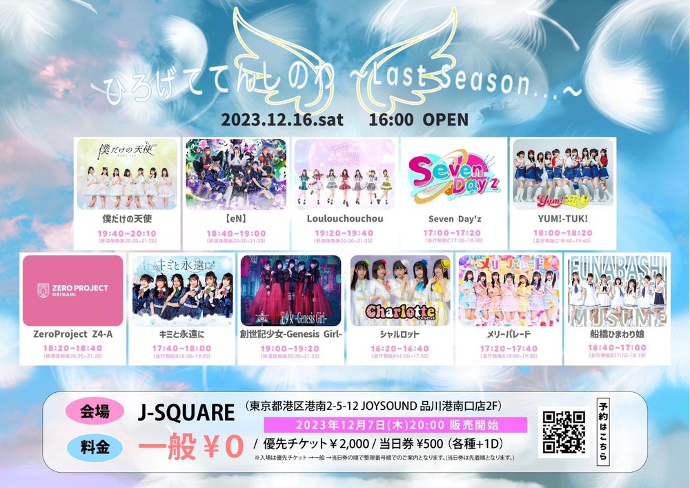 『僕だけの天使』デビュー月間 ひろげててんしのわ 〜Last Season...〜 SCHEDULE 2023/12/16(土) 18:00 - 19:40 品川J-SQUARE 地図を表示 【時間】 OPEN 16:00 / START 16:20 LIVE 18:00 ~ 18:20 特典会 18:40 ~ 19:40 《C》 【会場】 品川J-SQUARE 【チケット料金】 一般無料 優先2,000円(各種+1D、当日+500円) ※野口夏暖は体調が優れないため、大事をとってライブをお休みいたします。 12/7(木) 20:00からチケット販売 URLをコピーする 報告する