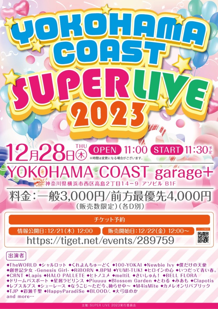 【野口夏暖ラストLIVE】YOKOHAMA COAST SUPER LIVE 2023 SCHEDULE 2023/12/28(木) 13:30 - 15:10 YOKOHAMA COAST garage+ 地図を表示 \野口夏暖・10人ラストLIVE/ OPEN 11:00 / START 11:30(予定) LIVE 13:30 ~ 13:50 特典会 14:20 ~ 15:10 《B》 【会場】 YOKOHAMA COAST garage+ 【チケット料金】 一般 ¥3,000 前方最優先チケット ¥4,000 (各D代別) 12/22(金) 12:00からチケット発売 URLをコピーする 報告する