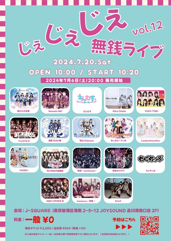 じぇじぇじぇ無銭LIVE Vol.12 SCHEDULE 2024/07/20(土) 15:50 - 18:00 品川J-SQUARE \みちのリアルバースデー🎂🧡/ OPEN 10:00 / START 10:20 LIVE 15:50~16:10 特典会 17:00~18:00(終演後物販) 【会場】 品川J-SQUARE 【チケット】 一般無料 / 優先2,000円 (各種+1D、当日+500円) チケットはこちらから URLをコピーする 報告する