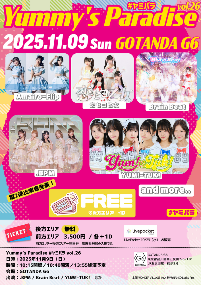 【ヤミパラ】Yummy’s Paradise #ヤミパラ vol.26 SCHEDULE 2025/11/09(日) GOTANDA G6 開催日時 2025年11月9日(日) 開場10:15 開演10:40 出演時間 特典会 会場 GOTANDA G6 チケット 前方エリア ¥3,500 / 後方エリア ¥0 / 各+1D¥600 指名入場特典 10/29(水)12:00〜チケット発売 URLをコピーする 報告する