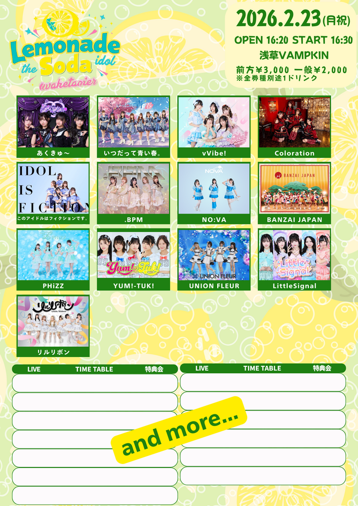 LEMONADE SODA SCHEDULE 2026/02/23(月) 浅草VAMPKIN 開場16:20 開演16:30 出演時間 特典会 会場 浅草VAMPKIN チケット 前方エリア ¥3,000 / 一般エリア ¥2,000 / 各+1D ¥700当日券 各+¥1,000 指名入場特典 特典券1枚 1/14(水)19:00〜チケット発売 URLをコピーする 報告する